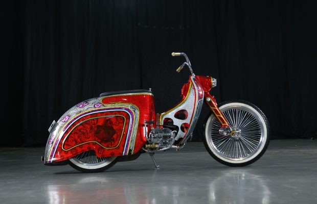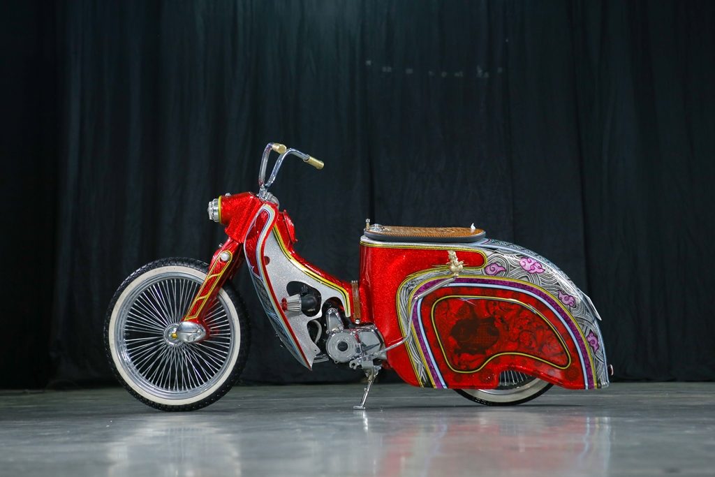 Selanjutnya bagian velg dan tromol yang di kustom menjadi 72 lubang, jok memakai kulit sapi asli yang di kustom menjadi kulit buaya. “Di motor ini beberapa masih menggunakan part ori motor Honda seperti sayap depan dan panel lampu milik Honda Unyil C102,” ujarnya.