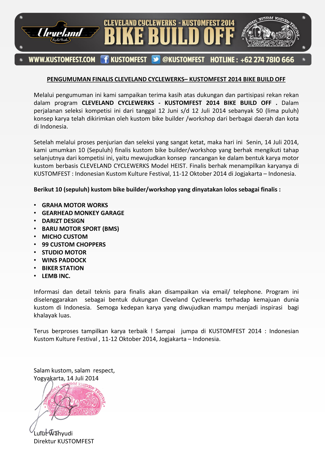 Setelah melalui proses penjurian dan seleksi yang sangat ketat, maka hari ini Senin, 14 Juli 2014, kami umumkan 10 (Sepuluh) finalis kustom bike builder/workshop yang berhak mengikuti tahap selanjutnya dari kompetisi ini, yaitu mewujudkan konsep rancangan ke dalam bentuk karya motor kustom berbasis CLEVELAND CYCLEWERKS Model HEIST. Finalis berhak menampilkan karyanya di KUSTOMFEST : Indonesian Kustom Kulture Festival, 11-12 Oktober 2014 di Jogjakarta – Indonesia.