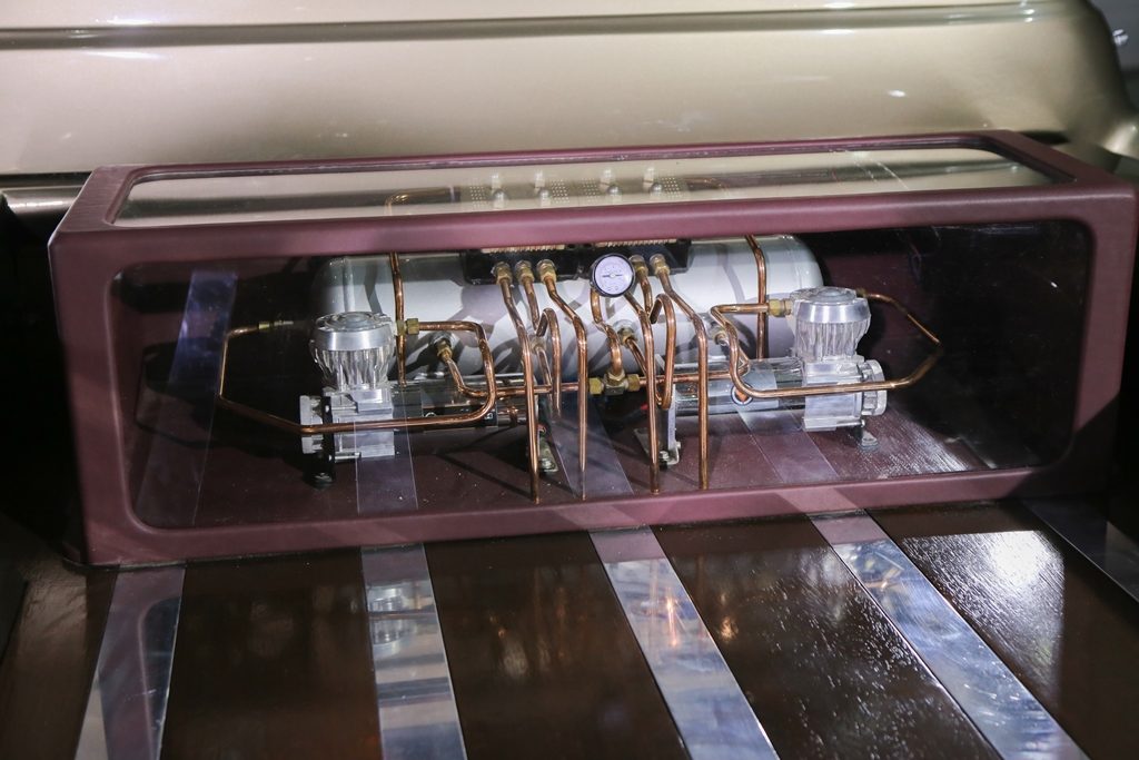 “Untuk pemanis, di landasan bak truk nya kita kustom menggunakan papan kayu dan plat aluminium. Untuk air suspension kit kita buat box dan jalur-jalur anginnya kita buat dari pipa tembaga yang dipoles,” papar Erman.