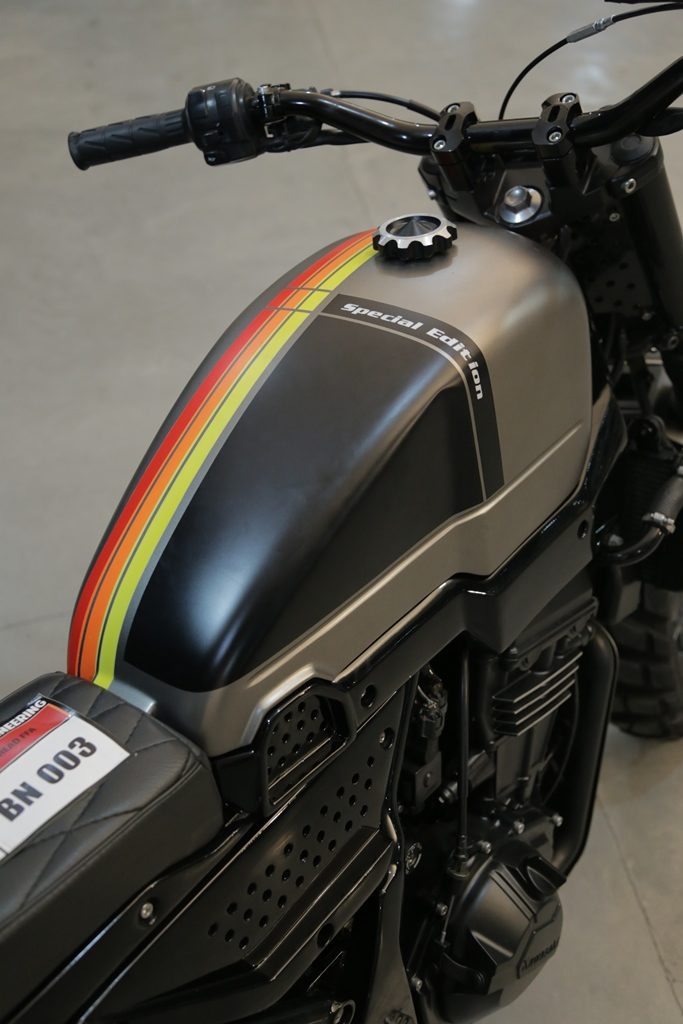Hendra memilih stang simple dengan model fatbar supaya handling tetap nyaman. Bagian tangki juga dirubah jadi sedikit lebih ramping dari aslinya. Pada jok dipilih model flat yang tetap nyaman dan nampak empuk untuk penunggangnya. Ditambah penampilan frame headlamp dan knalpot custom dengan warna senada, membuat motor ini terlihat serasi.