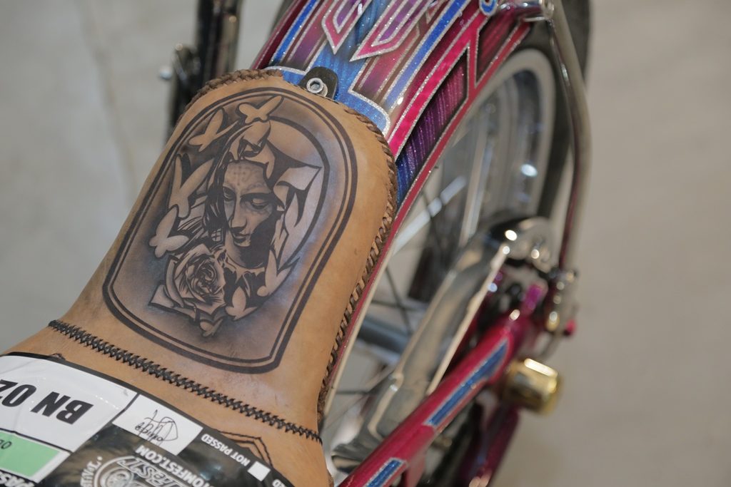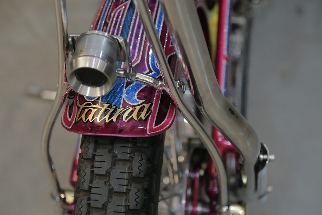 Di bagian frame, motor yang diberi julukan “Pink Lady” tersebut menggunakan material pipa seamless 3/4 inch untuk semua susunan tulangnya. Sementara, di bagian springer depan menggunakan material stainless. Kombinasi inilah yang membuat Pink Lady menjadi terlihat keren dan easy riding. Demi kenyamanan, sang builder mengambil konsep skinny chop namun lebih di-slimkan.