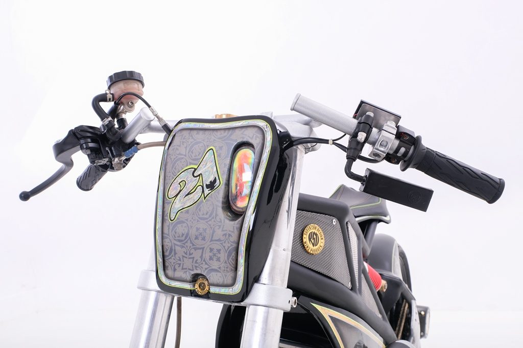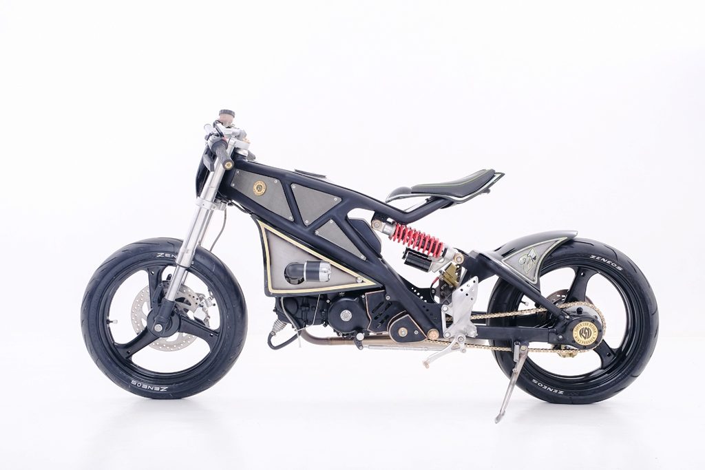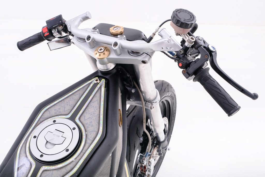 Untuk membuat motor ini, sang builder hanya mengandalkan mesin saja. Sedangkan rangkanya, dibangun dari nol. Dengan bentuknya yang ekstrem, butuh trik jitu untuk bisa menempatkan tangki di antara rangka yang dikelilingi deltabox.