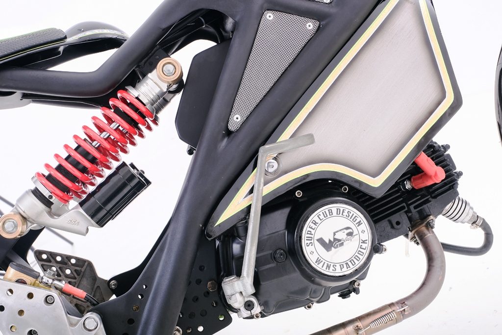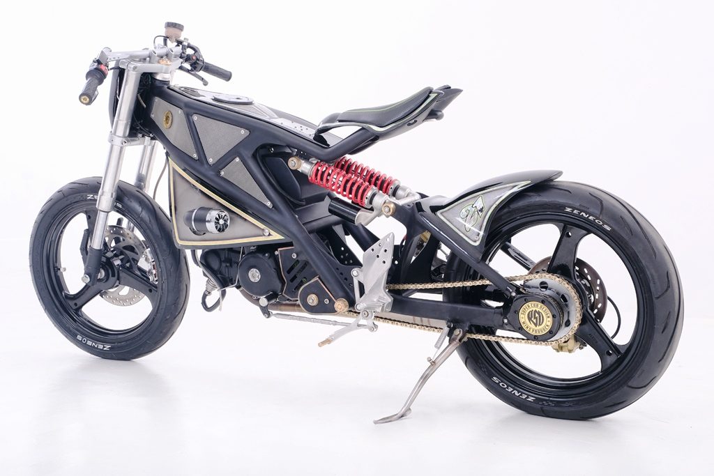 Keunikan motor ini bukan hanya pada desain rangka, tapi juga suspensi belakangnya. Alih-alih menggunakan monoshock, motor ini tetap mengandalkan dual shock. Sudut kemiringan sokbreker dibuat 45 derajat, sesuai dengan standar spesifikasi yang ditetapkan oleh Rolland Sands.